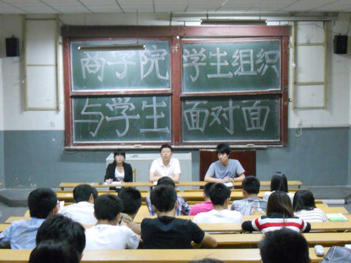 会议伊始,宁远说到,商学院三大学生组织旨在丰富同学们的大学生活,了解同学们的需求,以达到更好的为同学们服务的目的。学院学生会更多的是起到沟通老师与同学之间的桥梁作用,协助学院团委及相关部门来更好的服务同学。接着,他谈到,商学院学生会正处于成长阶段,各项体制仍需完善,各学生部门各项工作也应做到公正、公开、公平。目前商学院学生组织正逐步完善自身建设,举办特色活动以及推进维权调研工作,并希望学生理解并支持学生组织的工作,从各项活动中得到真正的能力提升。接着,李毅向在场同学阐明宿舍卫生检查和宿舍熄灯检查制度,然后介绍了自律会本学期开展第二届宿舍文化节,该活动已经通过优良学风宿舍,雅室设计大赛等一系列活动逐渐开展。接着,何倩如简单介绍了商学院社团的情况,各社团通过举办特色活动,深入企业交流、开通人人网公共主页等形式,逐渐拓宽接触面,提高了自身的组织协调能力,她说道,商学院先后共有9个社团分获山东理工大学名优社团。交流会最后,到场同学开始就学院学生组织工作中出现的问题陆续向学生组织负责人提出意见和建议,三位负责人就所提问题中涉及的学院工作、宿舍问题、社团活动等方面做出了细致而全面的回答。
