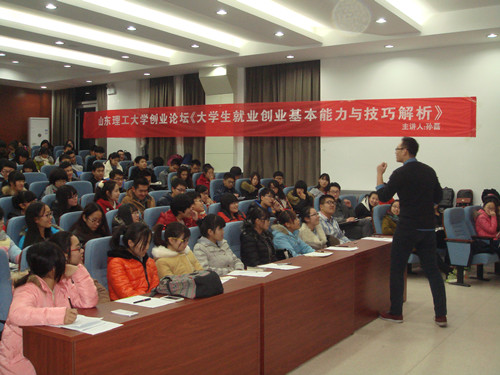 激情点燃梦想,创业成就未来。12月9日晚,由山东理工大学校团委主办,商学院承办的学生创业论坛在四号教学楼报告厅举行,此次论坛主题为“大学生就业创业基本能力与技巧”,淄博友森国际贸易有限公司、维趣进出口有限公司董事长助理、我院国贸专业校友孙磊担任主讲,对就业创业感兴趣的学生代表参加论坛。