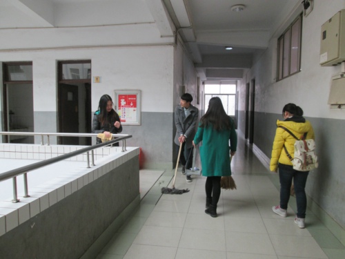 合理分工,高效工作,同学们发扬“钉子”精神,“钻”透教学楼每一个死角。