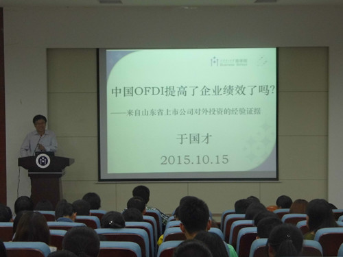 10月15日晚,我院金融学系老师于国才在四号教学楼报告厅就“山东对外投资情况”向大家作了一场精彩的学术报告,与在座同学分享交流,分析了“中国OFDI提高了企业绩效了吗”这一热点问题。