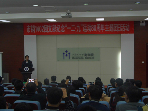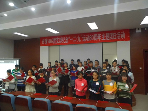主题团日活动由市场营销1402班团支部书记朱琳主持。她从“四进四信”活动的开展以及荣誉成果等方面介绍团支部基本情况。随后,全体人员观看了“12.9”运动纪录片,重温了那段激情燃烧的岁月。团支部成员就“为什么要纪念‘12.9’运动”和“如何传承‘12.9’运动精神”积极讨论,从国与家、责任与担当以及网上不同的声音等方面阐述了作为青年学子对于“12.9”运动精神的认识并朗诵自创作品《以青春的名义宣誓》。