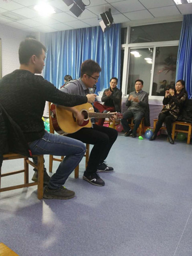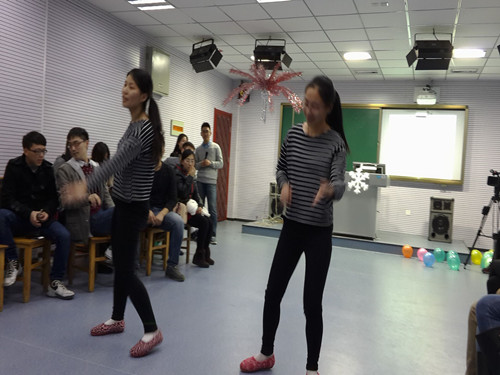 马文、刘亚静同学组成的“文静组合”以激扬的舞蹈串烧嗨翻全场;张琳琛等同学的男声独唱《斑马斑马》、《千方百计》、《精忠报国》和清新女声合唱《暖暖》引得台下高潮迭起,掌声不断;杨曼等同学的自编单口相声《报天气》、小品《我很丑,但我很温柔》更是让大家忍俊不禁。晚会穿插进行几轮竞争性小游戏、大抽奖等环节,为活动增色不少中。