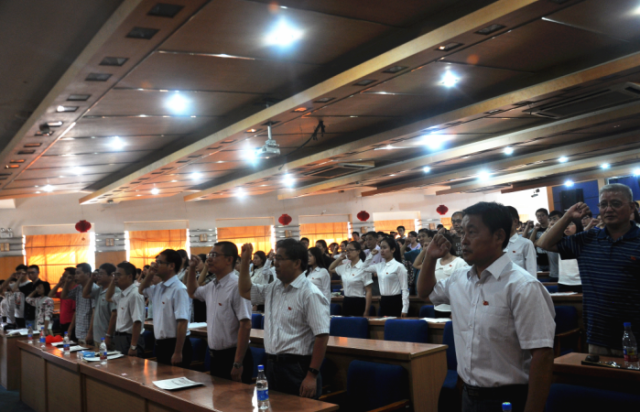 会后,学院举行“亮出党员身份” 集中佩戴党员标志牌和重温入党誓词活动。