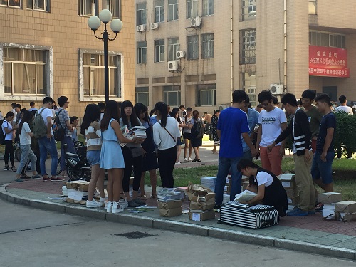 28日上午,各班级在图书馆西侧领取新学期教材。