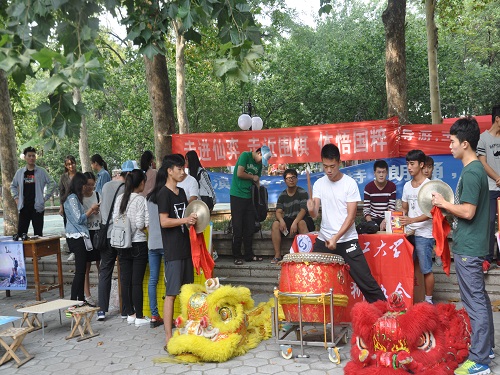 远远便听到前方热闹喧天,一踏入中心花园,便被眼前浓郁的社团文化氛围所感染。前有创业菁英为你宣讲创业的精彩,后有心情驿站为你打开心灵的小窗;这边国学社的同学们一身汉族传统服装惊艳路人,那方吉他协会的成员指弹之间,轻轻拨弦,便高声开唱。实战营销、经济学人、户外先锋、风舞轮滑……一个又一个精彩纷呈的社团,不胜枚举。五彩的气球纷飞,各种各样的小游戏吸引众人,更有社团成员身穿玩偶服逗得现场阵阵欢笑。每个社团成员都认真负责,他们对前来咨询的大一新生耐心讲解,并指导他们如何填写报名表。而且每个社团宣传方式各有不同,有的进行现场表演,有的发放单页,有的通过特殊活动吸引同学。一位社团成员这样说道:“希望今天能有更多志同道合的学弟学妹们加入我们的大家庭,一起交流进步,共享我们的大学时光。”活动现场人来人往,熙熙攘攘,宛如盛大的节日。随着舞狮成员踏着鼓点威仪而来,全场气氛走向最高潮。