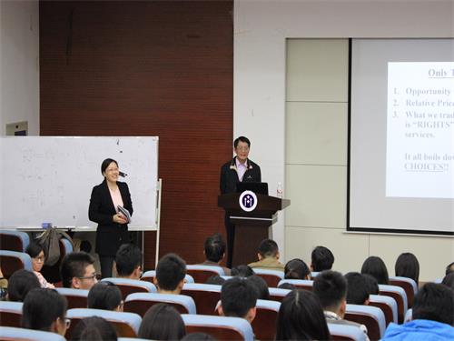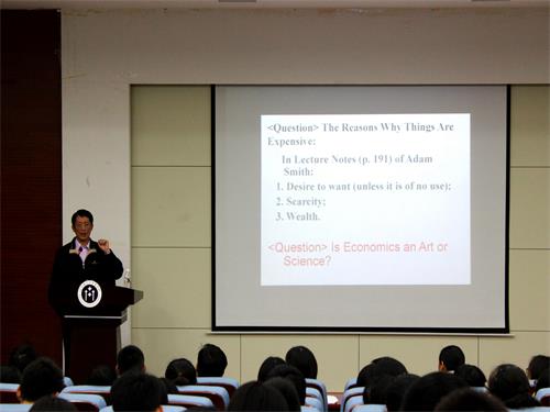 首先,张红霞向师生们就张国平教授的主要研究领域以及所获得的相关成就进行了简单的介绍。接着,张国平从经济与管理的基本概念讲起,向师生们提出“经济和管理到底讲的是什么?”的疑问。他通过产品与效益分析、决策的方法与道路和所有权等方面详细的解释了经济与管理,并利用多个生动有趣的例子把复杂问题简单化,调动师生积极性。其中,在产品效益分析与决策中强调:成本与效益不发生在同一时间,效益发生在未来。而决策具有不确定性,制定决策的过程中需要根据环境的变化来改变方向与方法。随后,他对经济学原理进行了重点讲解。他指出,我们所熟知的“经济学十大原理”出自美国著名经济学家曼昆的《经济学原理》,虽然这十大原理能够很好的阐述经济这一学科,但部分条目过于繁琐。张国平将其总结为三大原理,即机会成本、相对价格和对市场的选择。并通过分条举例对该原理进行了解释。之后,他又对“剥削”问题进行了简单的讲解。最后,张国平向师生们阐述了读书的重要性,鼓励大家多阅读经典著作,并向师生们推荐了《国富论》、凯恩斯的《通论》、熊彼得的《经济发展理论》等相关经济学著作。