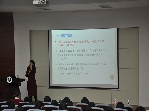 讲座伊始,张海伟向在座同学介绍了课题研究背景,一是战后国际贸易的蓬勃发展大大促进了世界经济的持续增长,二是西方新制度经济学的兴起,为研究国际贸易问题提供了全新的视角。她随后提到,有效的制度可以降低交易成本,并且用图形演示了国际贸易的重要性,以及制度对经济增长和国际贸易产生的深远影响。紧接着,她从概念界定方面对什么是制度、制度范围的界定作出简要阐释。