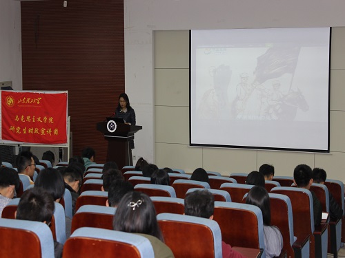 会议伊始,王常春首先向与会人员介绍了马克思主义学院研究生实证宣讲团,并邀请宣讲团成员郭乾、齐应雪、张霞为同学们展示“纪念红军长征80周年”主题宣讲。宣讲以PPT与视频的形式向同学们介绍了红军的长征历程,并阐述了长征的伟大意义,同时提出我们现在生活中的“四大考验”与“四大危险”,“六个必须”与“六个启示”,使“弘扬伟大长征精神,走好今天的长征路”这个主题深入人心。