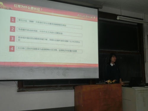 经创1601、金融1602、信管1601班等团支部进行长征主题宣讲活动,以较好的精神面貌和共青团员应有的素质顺利完成,明确了长征的意义,弘扬了长征精神,激发了同学们的爱国热情,树立了远大的理想——中国梦。红军战士的严守纪律、亲密团结、顾全大局的行为和积极乐观的心态激励各班学生努力拼搏、积极向上、认真学习,为祖国的社会主义建设而努力奋斗。