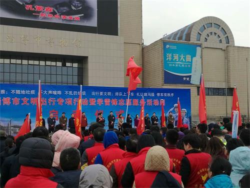院学生会志愿服务部组织的志愿服务部志愿者来到淄博市博物馆,参与淄博市举行“全市文明出行暨学雷锋志愿服务活动周启动仪式”,在全市开展市民文明出行专项行动。活动现场,市文明办还设立了宣传展板,淄博文明网开设网络留言平台,志愿者们与市民纷纷通过扫码关注的方式,积极在平台上留言互动。活动当天,众多志愿队伍纷纷走进社区,开展免费为市民量血压、问诊等志愿服务活动。受到广泛好评。