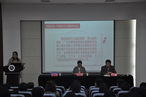 3月23日下午,我院在四号教学楼二楼报告厅举行“学习总书记讲话,做合格共青团员”教育实践动员会。校团委副书记高静静、院党委副书记王光坊、院学生科各辅导员,各班班长、团支书及各学生组织主要负责人参加了此次会议。