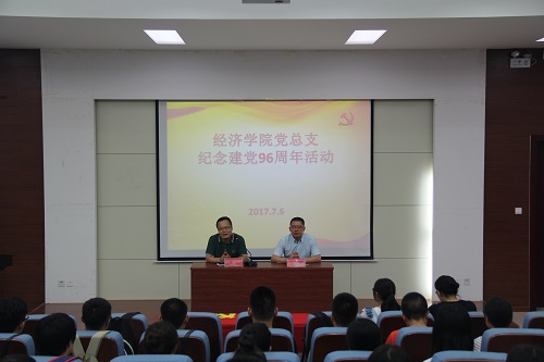 为进一步坚定广大学生党员永远跟党走的信念,牢记党员使命。7月6日晚,经济党总支在四号教学楼二楼报告厅开展纪念建党96周年活动。院党总支书记张双、院团委书记朱星辉及近五十名学生党员参加此次活动,学生科辅导员毛婷主持。