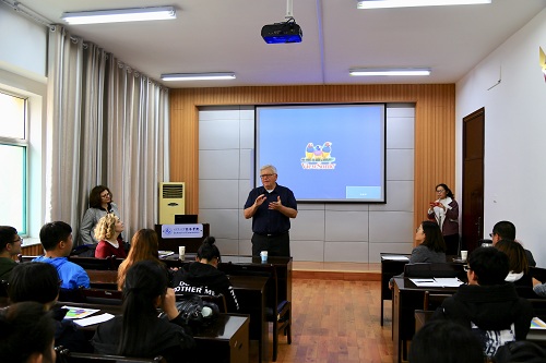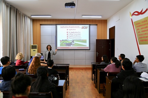 活动伊始,李娜简单介绍了美国宾夕法尼亚布鲁姆斯堡大学概况和三位主讲人,并向同学们介绍该校与我校间的2+2+1经济、2+2计算机、暑期短期项目三个合作项目,娜瓦尔·博诺莫则从申请要求、学院、教学设施、校园、住宿、学生生活等方面作详细讲解。随后,参加过暑假短期培训的学生代表何少华就其培训经历与在座同学进行了分享交流,她认为,该培训能够在增强自身对美国认识的同时,提高英语口语能力。接着,蒂娜·恩茨明通过以往同学们参加美国文化课程、练习保龄球、参观自由女神像、组织烧烤活动等学习生活照片呈现给在座同学,同时她讲到,交流项目在原有基础上做了两方面改进:即两人宿舍中会安排一位会讲中文的美国人,帮助中国学生提高英语;可通过旁听课程等形式增加两国学生之间的互动。最后,吉姆·庞弗里特鼓励同学们积极提问,对所有问题进行仔细回答并以巧克力相赠。活动于掌声中结束。