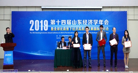 年会闭幕式由山东经济学年会秘书长、山东大学研究生院常务副院长刘国亮教授主持。山东大学《产业经济评论》编辑部主任、山东大学经济学院曲创教授宣读了2019年第十四届山东经济学年会优秀论文获奖名单并举行了颁奖典礼。我院研究生王悦的论文《生产性服务贸易对中国制造业全球价值链地位提升的影响研究》获得2019年第十四届山东经济学年会优秀论文奖。