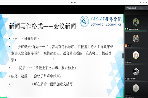 随后,队员梅晓婷从新闻稿撰写格式、新闻稿案例、照片摄影及投稿四方面出发通过讲解PPT的方式对团队成员进行新闻培训并分享新闻稿撰写投稿经验,其中她结合经济学院、理工青年等其他校级网站所下发的“暑期社会实践投稿流程”文件依次阐述投稿流程,对各个网站不同投稿要求进行分析整合,明确最终新闻稿撰写格式。紧接着,团队成员围绕社会实践流程、分工安排、新闻培训内容进行讨论,并依据自身经验提出相关建议以及商讨“沂路长征”实践团今后社会实践工作要点。最后,团队成员进行“云合照”,会议在掌声中结束。