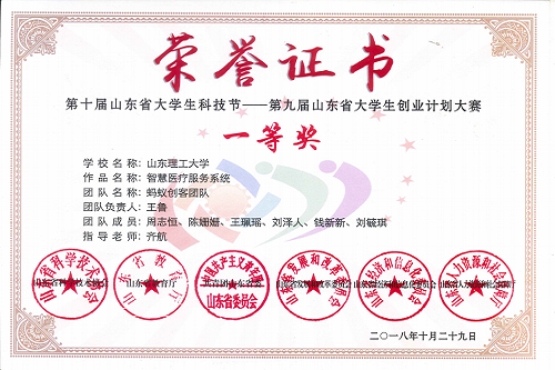 2018 年第九届山东省大学生创业计划大赛一等奖,