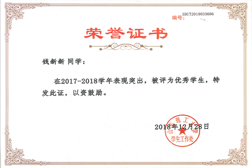 钱新新、女、中共预备党员,经济1703班学生,曾担任班长、辅导员助理、资管委七星志愿者等职务;大学三年平均学分绩点 91.0786,位于 2017 届经济学专业毕业生第1;大学期间累积获得国家级奖学金2次,省级奖项2项,发表期刊论文1篇,校级奖项10余次。