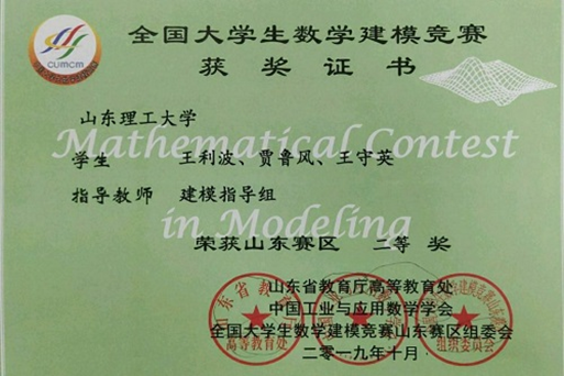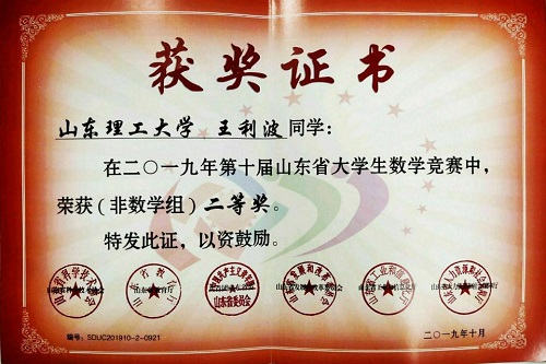 王利波,金融学1704(创新)学生。在2017年至2019年中,学业绩点专业第4。在全国大学生数学建模竞赛中两次获山东赛区二等奖; 2019年10月在第十届山东省大学生数学竞赛中获二等奖;2019年11月在全国大学生数学竞赛中获三等奖; 2020年6月在第十七届五一数学建模竞赛中获一等奖;2020年9月在第六届“互联网+”大学生创新创业大赛中获省级银奖。