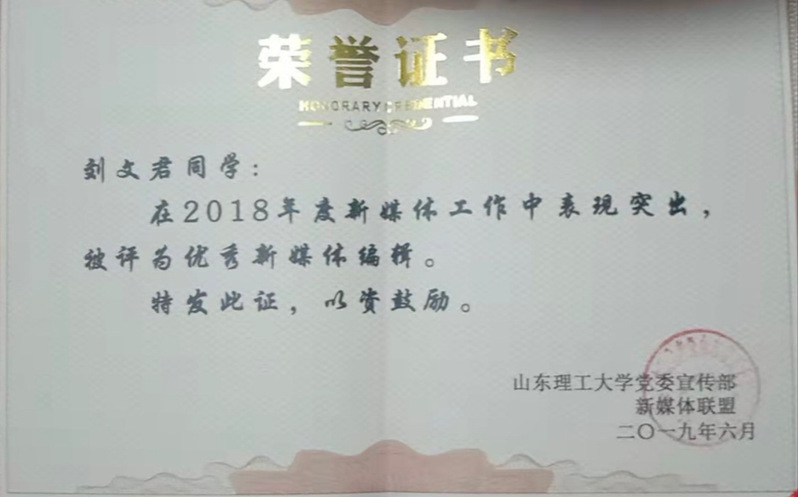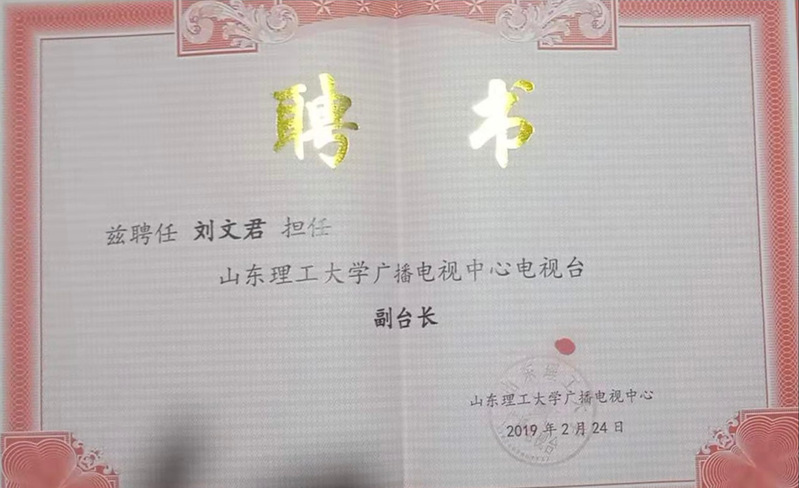 刘文君,女,山东威海人,共青团员,山东理工大学经济学院国际经济与贸易专业大四学生。曾任山东理工大学电视台副台长、山东北方淄特特种油股份有限公司电子商务部经理。学习成绩优异,实习实践经验丰富,顺利成为山东英科环保再生资源股份有限公司国际营销部一员。
