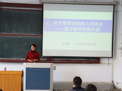 牛喜霞从教学创新大赛基本要求、材料准备、个人体会等三个方面展开讲述。在大赛的相关要求方面,牛喜霞从大赛背景、赛制、参赛对象、分值和环节等方面进行介绍。在材料准备方面,她详细介绍了申报书、课堂实录、创新报告、汇报PPT的相关要求和注意事项,特别是在申报书方面,牛喜霞深度解析教学创新的内涵与实质,强调教学学情分析的重要性,通过对教学创新的方法和途径进行了深入浅出的讲解,使在座老师对教学创新有了更为直观的认识。同时,她以自身教学经验及成长历程为例,指出创新是教学和科研的灵魂,倡导老师们做研究型、创新型教师,完成从站好讲台到站稳讲台再到爱站讲台的蜕变,争做“四有”好老师。
