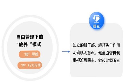 一是明确班级自我管理模式。为加强班集体建设,提高成员自主创新活力,2019年10月,班集体创新性采取自主管理模式下的“放”“养”模式,采用“放”“养”式管理,放的是思维,养的是行为习惯,在互相学习的过程中促“养成”。