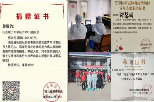 五是班级共战“疫”——肩负使命众志成城。面对突如其来的疫情,冷静沉着并怀着“总有人要去,为什么不是我”的勇敢无畏精神,经济1901班多名同学积极参与到社区疫情防控工作中。疫情突发,本班向湖北省慈善总会捐款一千余元。至今,邵馨阅、陈均梓、刘健海、庄严、张洪硕等多名同学都曾加入到社区疫情防控工作中,在实际行动中彰显大学生志愿者的奉献精神。陈均梓同学被评为山东理工大学疫情防控优秀志愿者、张洪硕评为枣庄市优秀青年志愿者。