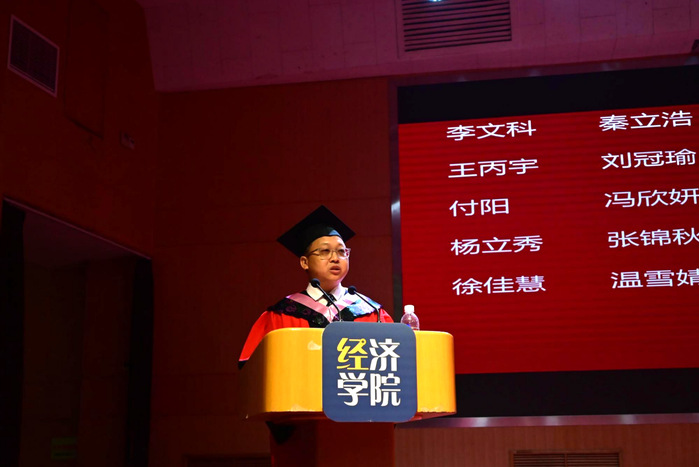 张志新宣读学位授予决定并致辞,他代表学院向为毕业生辛勤付出的家长、倾心教导的师长以及一路相伴的同窗致以最诚挚的感谢,并向全体毕业生表示最热烈的祝贺。张志新回顾了四年来全院师生同心同德、砥砺前行的历程,共同见证了学院在党建引领下实现高质量发展,科研创新成果丰硕,国家级项目屡创佳绩;前瞻布局数字经济等新兴交叉学科,构建现代化专业体系;育人成效显著提升,考研深造率持续攀升。他深情寄语毕业生:过往的奋斗与成长已成为心中珍贵星火,无论未来行至何方,经院的目光将永远深情凝望,经院“经世济民”的精神将在你们身上延续不息,你们的风采就是经院形象的最闪亮的名片。