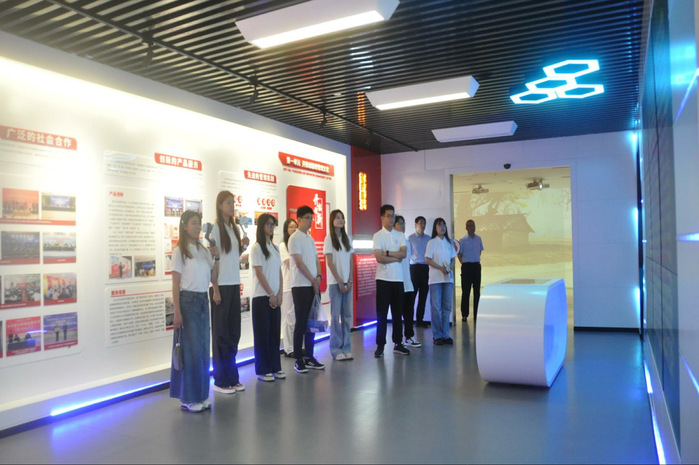 在参观中,生动的历史再现成为焦点,在上世纪金融服务场景复原区内,老式柜台、算盘、储蓄标语瞬间将实践团成员们带入往昔岁月。驻足体验间,大家切身感受到金融服务从“人工操作”到“智能便捷”的巨大变迁。沿着清晰的发展时间轴深入,从1999年机构组建、2005年深化改革到2016年迈向现代化金融企业的关键跨越,每一节点都烙下党建引领的鲜明印记,展现以沂蒙精神为源的艰苦创业历程。展馆还生动呈现了农商银行深厚的企业文化和丰富的党建成果,彰显着红色基因的蓬勃脉动与“传承与创新共生”的文化内涵。