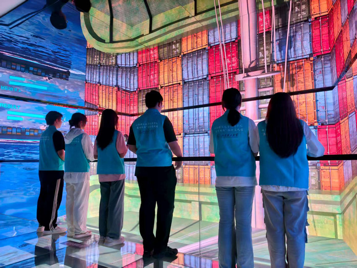 国际陆港纪录片以四屏联动、多视角同步播放的形式给实践团成员带来强烈的视觉冲击。讲解员就国际陆港服务乡村振兴的四港联动模式展开详细介绍,让实践团成员对这一模式有了更深入的认知。