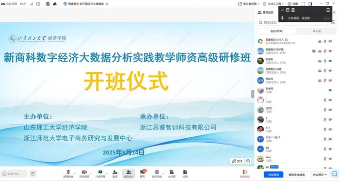 随着数字经济蓬勃发展,大数据已成为推动商业创新与决策的关键。9月14日,由经济学院和浙江师范大学电子商务研究与发展中心主办,浙江思睿智训科技有限公司承办的第十四期“新商科数字经济大数据分析实践教学师资高级研修班”顺利举行,旨在系统提升高校教师在数字经济大数据分析领域的理论与实践教学水平。