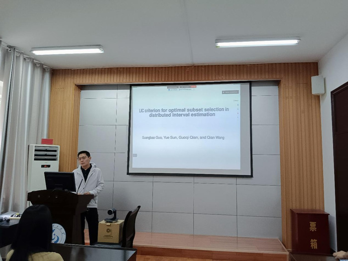 郭广报以《LIC criterion for optimal subset selection in distributed interval estimation》为题作学术讲座。他首先介绍了分布式区间估计的基本概念与模型形式,重点强调在分布式线性回归模型中,通过选择最优数据子集以提升估计效率与准确性的实现路径。随后,郭广报详细阐述了 LIC 准则的理论基础—该准则以筛选最优数据子集为核心目标,通过最小化相关置信区间长度、最大化相关信息量的双重逻辑达成这一目的。他进一步通过模拟实验验证了 LIC 准则的稳定性:不仅展示了不同数据子集选择方案下的模拟结果,还通过分析均方误差(MSE)与平均绝对误差(MAE)两大性能指标,清晰呈现了 LIC 准则在不同数据集上的实际应用效果。最后,他总结了LIC 准则的核心贡献,同时提出了未来研究的潜在方向。在互动环节,与会学生积极提问,现场学术氛围浓厚。