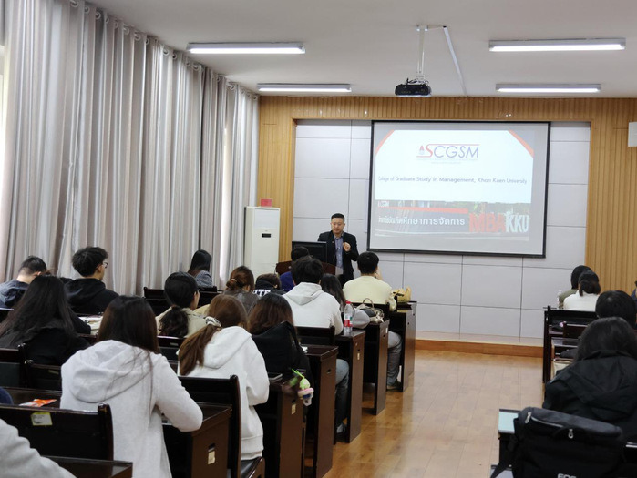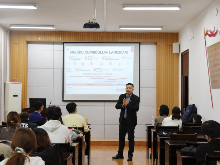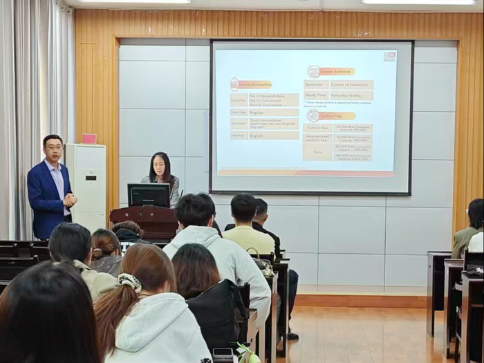 宣讲会上,毕传辰首先从发展历程、教育质量、校园规模及社团活动等维度,系统介绍了孔敬大学的整体情况。随后,他聚焦该校MBA项目,详细解读了课程所涵盖的八大核心模块及多样化的体验式学习环节,并明确梳理了申请条件、毕业要求及关键时间节点,为有意向的学生提供了全面、实用的申请指导。