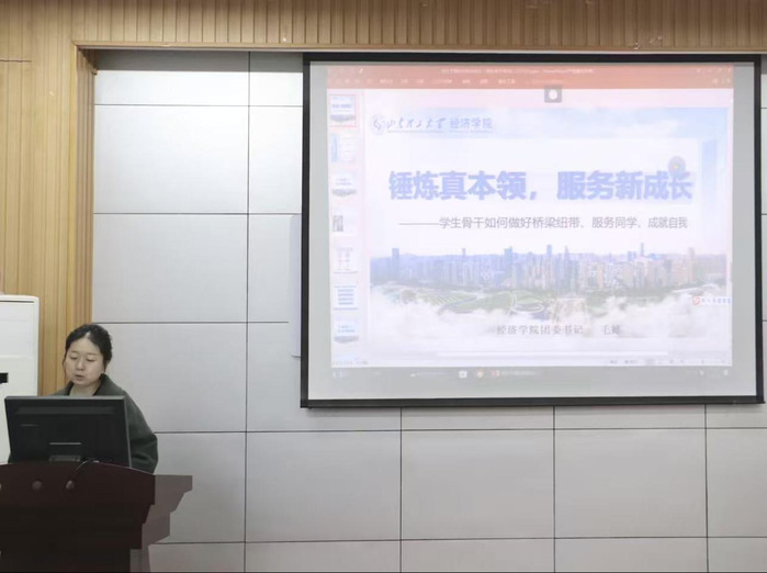 为引导学生骨干明确职责定位,实现服务同学与自我成长的双向促进,10月23日下午,经济学院于4号教学楼316会议室举办“经英启航”学生骨干培训班主题团课。本次团课由学院团委书记毛婷主讲,培训班全体学员参加。
