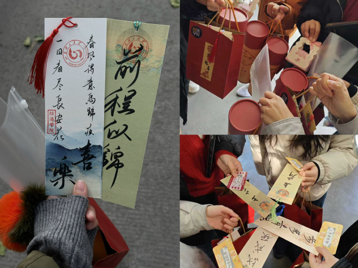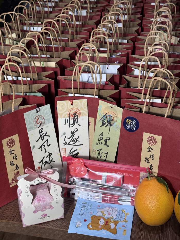 暖心赠礼分为基础款“金榜题名”考研加油包与升级款考研助力盲盒,每份加油包中都寄托着美好的祝愿。其中基础款加油包中的甜橙寓意心想事成、前程似锦,蒸汽眼罩助力学子放松身心、轻装上阵,文具套装则象征着踏实备考、从容书写,这些精心准备的礼物既为学子提供了切实的备考支持,也传递着“逐梦路上,与你同行”的温暖。而升级款考研助力盲盒更将现场气氛推向高潮,内含多款寓意美好的文创好物,由学生现场抽取,其中“柿柿如意”摆件寄托事事顺心的祝愿,“题名蜜礼”糖果礼盒寓意苦尽甘来、金榜题名,坚果“脑力补给”象征踏实积累、稳扎稳打,“上岸焕能锤”则鼓励学子击碎迷茫、全力冲刺。同学们满怀期待地抽取盲盒,开启瞬间惊呼与欢笑不断,大家互相展示抽到的好物、击掌鼓劲,暖意与奋进的力量在现场流淌。
