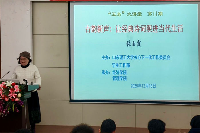 12月18日下午,由山东理工大学关心下一代工作委员会、学生工作部主办,经济学院、管理学院承办的“五老”大讲堂之“古韵新声”主题讲座在东校区4号教学楼二楼报告厅顺利举办。本次活动由“五老”代表、文学与新闻传播学院退休教师张玉霞担任主讲,学院学子积极参加本次活动。