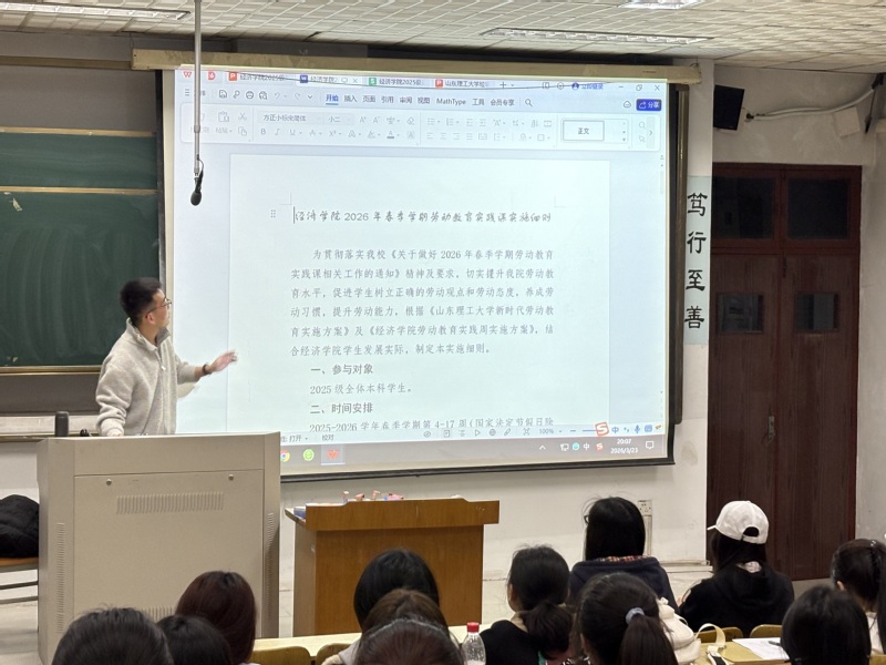 会议对《经济学院2026年春季学期劳动教育实践课实施细则》作了详细解读,重点说明了时间安排、岗位分配、考核方式及纪律要求等内容,帮助学生对劳动实践的流程与规范形成清晰认知。两位辅导员还就劳动实践期间的安全注意事项作重点强调,要求全体学生牢固树立安全第一的意识,严守操作规范,确保劳动实践安全有序开展。