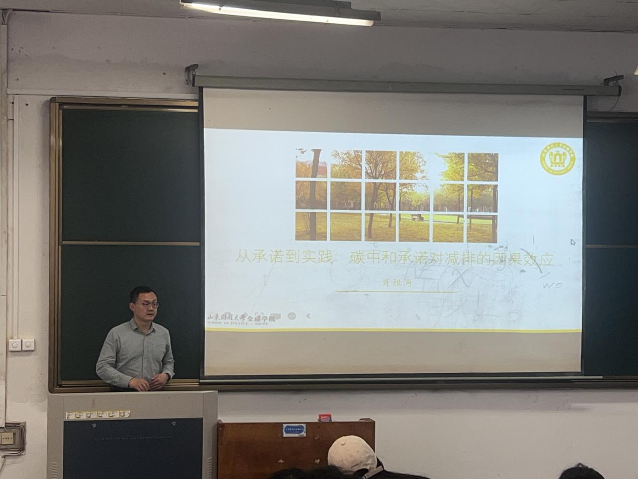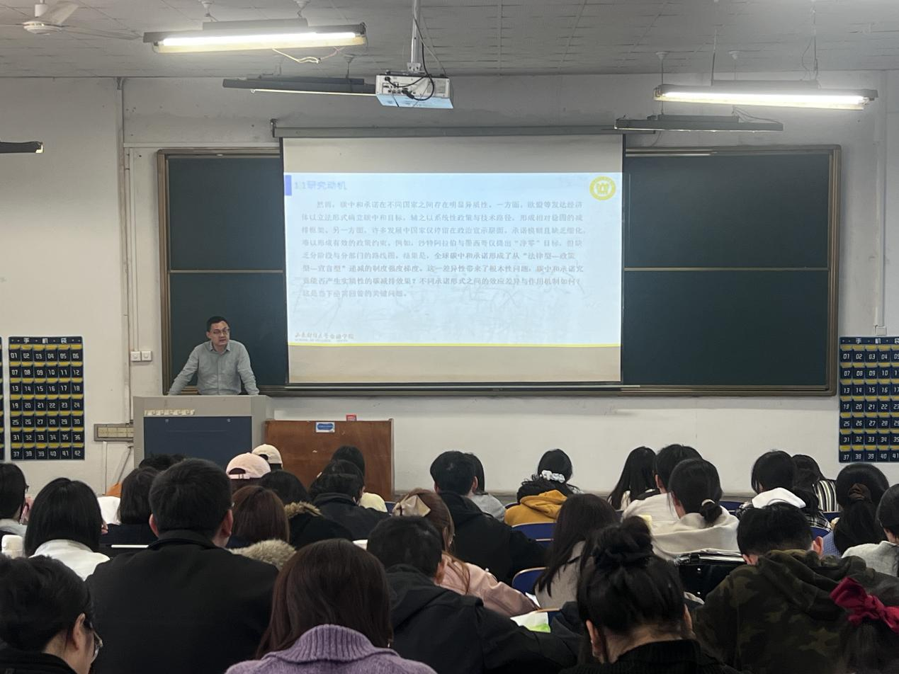在实证结果与研究结论部分,肖祖沔依次展示基准回归、外生性检验、稳健性检验、机制分析、异质性分析及健康效应分析等关键结果。研究表明,碳中和承诺能够显著降低碳排放,减排动力主要来自可再生能源发展与能效提升;不同国家治理效果存在差异,发达国家多维度治理成效突出,发展中国家则以舆论监督作用更为显著;电力、交通行业减排效果明显,工业领域相对缓慢,高排放国家在健康收益方面表现更为突出。在互动环节,与会学生积极提问,现场学术氛围浓厚。